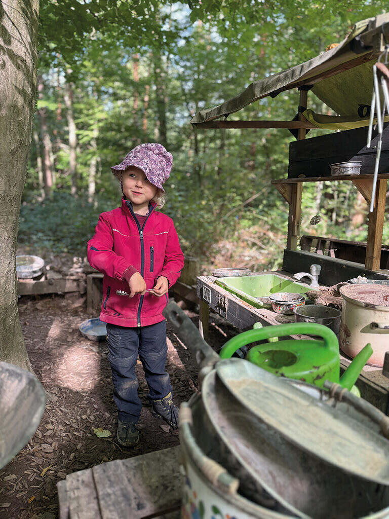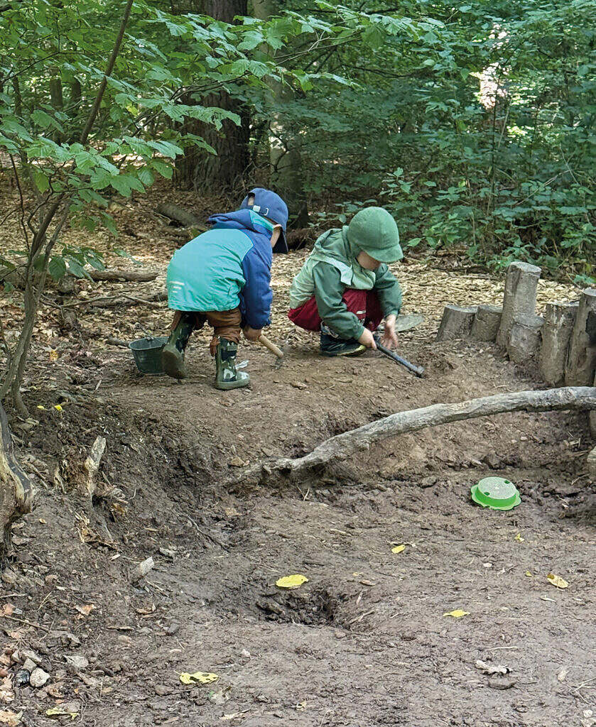 „Unsere Schlammgrube war im regenreichen Sommer das absolute Highlight“, erzählt Brigitte Bartsch. „Tagelang saß die ganze Gruppe darin, hat gematscht, gesiebt und die gesiebte Erde wie einen Schatz gesammelt.“ Besonders beliebt war es, sich an den Rand der Grube zu setzen und die Gummistiefel mit Wasser volllaufen zu lassen. Vor allem die die Geräusche beim Laufen haben für allgemeines Gelächter gesorgt. „Ich kann mir keinen schöneren Arbeitsplatz vorstellen,“ lacht Brigitte Bartsch, die Ruhe und Ausgeglichenheit der Kinder schätzt. „Hier draußen erleben sie den Wechsel der Jahreszeiten, hören das Vogelgezwitscher, spüren Sonne, Regen und Wind – mit allen Sinnen.“