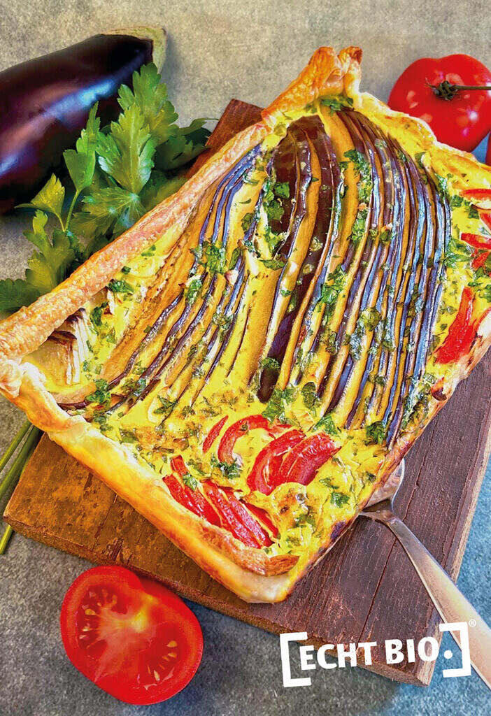 Aubergine und Tomaten waschen und halbieren. Aubergine in dünne Längsstreifen, Tomaten in Scheiben schneiden. Den Blätterteig (mit Backpapier) in eine Springform legen, Rand etwas hochziehen. Aubergine und Tomaten gefächert auf den Teig legen. Ziegenfrischkäse, Quark, Eier, gehackten Knoblauch, gehackte Petersilie, Pfeffer und Salz verquirlen und vorsichtig über das Gemüse gießen. Im vorgeheizten Backofen ca. 40 Min. bei 180 ˚C Umluft goldbraun backen.
