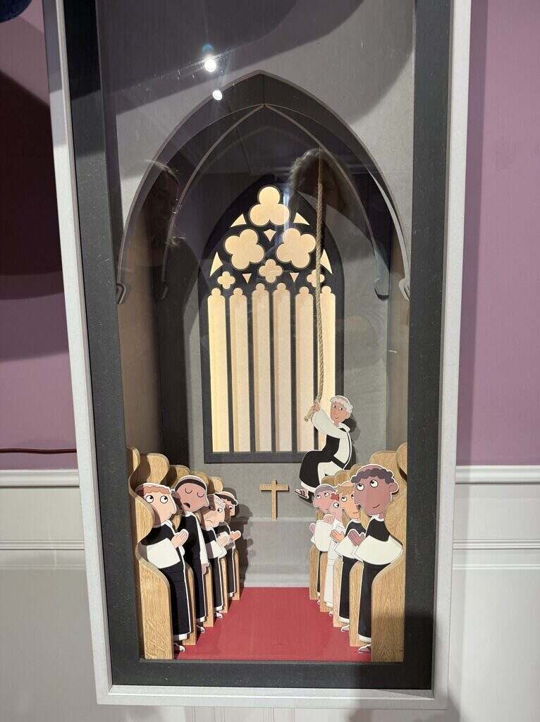 Ein ganz besonderes Highlight – und bei den Kindern besonders beliebt – ist die in warmen Rottönen gehaltene Werkstatt. Im Skriptorium, der mittelalterlichen Schreibstube, dürfen sie sich selbst an alten Schriften und kunstvollen Ornamenten versuchen. An einer weiteren interaktiven Station zeigt ein Puzzle anschaulich die Unterschiede zwischen gotischen und romanischen Fenstern, die anschließend beleuchtet werden können.