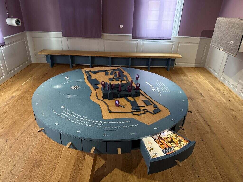 Ausgestattet mit einem Novizengewand und einem individuellen Mönchsnamen, den sie aus dem sogenannten Nam-o-mat erhalten, starten die jungen Gäste ihre Entdeckungsreise im Explora-Raum. In dessen Mitte steht ein großes rundes Holzmodell, das die Klosteranlage in Miniatur zeigt – und zugleich den Tagesablauf der Chormönche veranschaulicht. Der beginnt bereits um zwei Uhr morgens mit dem ersten Gebet und gliedert sich in feste Zeiten zum Arbeiten, Beten, Essen und Ruhen. Die Kinder erfahren, dass Wasser, Mühle und Garten innerhalb der Klostermauern lagen und der Alltag im Kloster streng organisiert und arbeitsreich war.